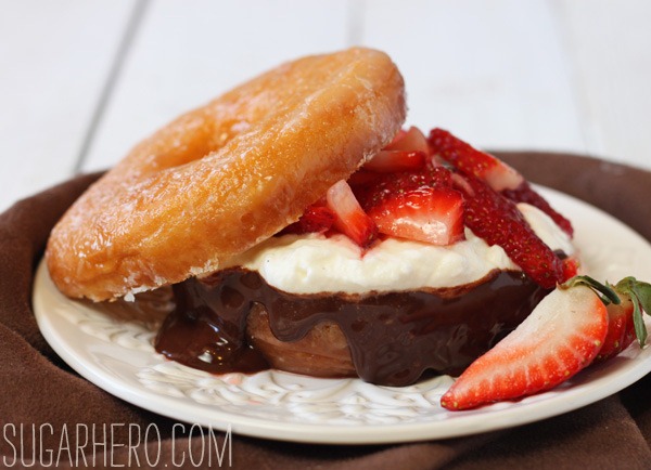 - Slice the doughnuts in half. Spoon the strawberries and their juices over the bottom half of each doughnut, and top with a big, billowy spoonful of cream. Add chocolate ganache or syrup if desired, and top the shortcakes with the doughnut top. Serve immediately.