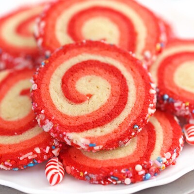 Peppermint Pinwheel Cookies are colorful sugar cookies with a minty twist! Pink and red sugar cookie dough is spiraled together to make beautiful, festive cookies that are perfect for Christmas, Valentine’s Day, or any special occasion.
