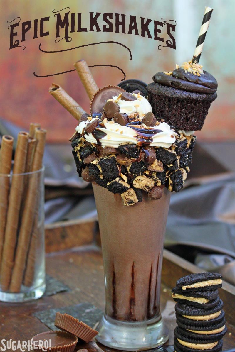 These are no ordinary milkshakes—these are Epic Chocolate Peanut Butter Milkshakes! They’re rich and creamy, and topped with an amazing selection of goodies like cookies, candy, whipped cream, and even a cupcake!