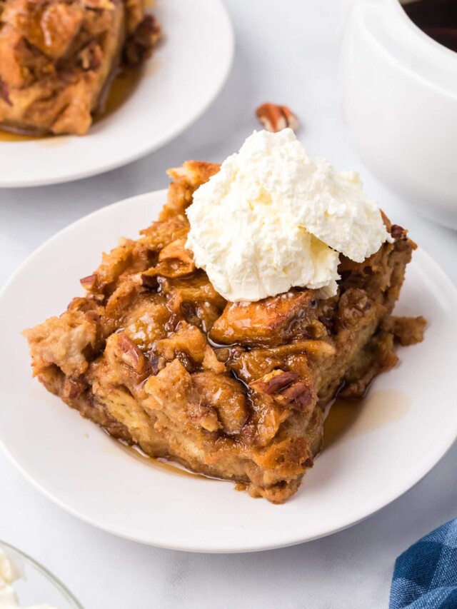 • Bake the ramekins at 350 F for 30-35 minutes, until the bread puddings are puffed, crunchy and browned on top, and barely jiggle when you tap them. If you’re using a 9×13 pan, bake it for 20 minutes, then cover the top with a loose layer of foil and bake for an additional 15-20 minutes.