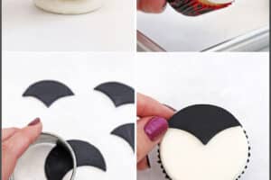- While the cupcakes chill, prepare your decorations. Roll out the black fondant until it’s about 1/8-inch thick. Use a circular cutter (about 2.5 inches wide) to cut out a black circle.